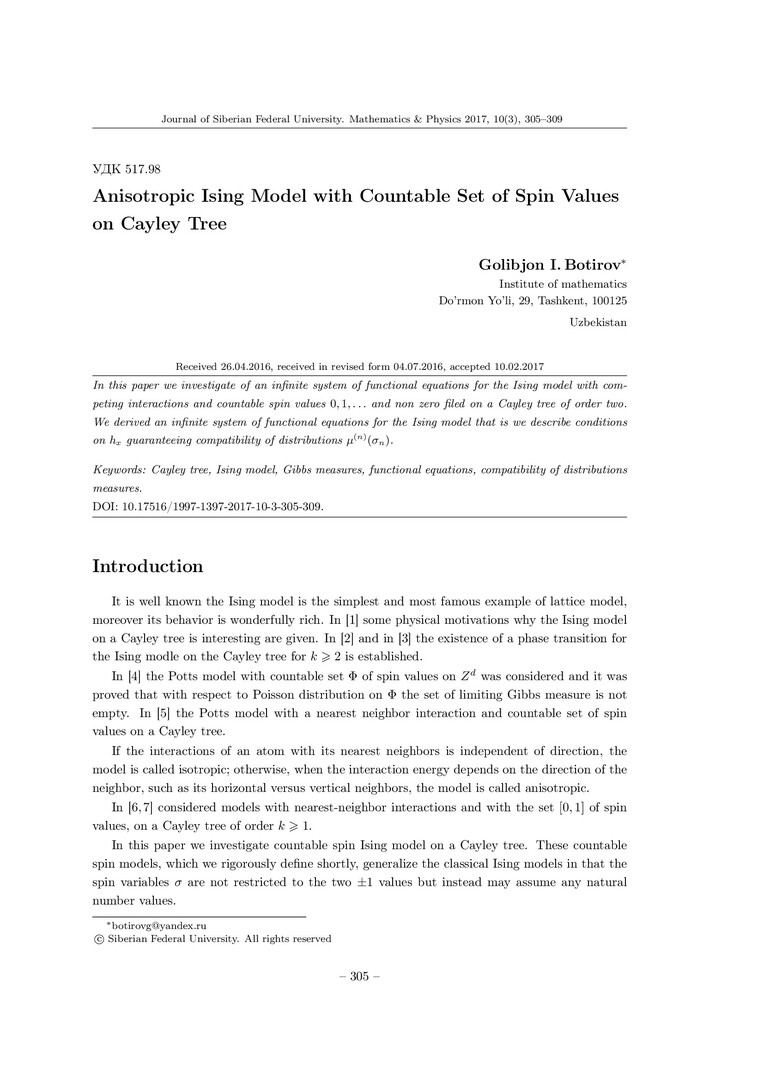 Библиографическое описание:Botirov, Golibjon. Anisotropic Ising Model with Countable Set of Spin Values on Cayley Tree = Анизотропная модель Изинга со счетным множеством значений спина на дереве Кэли / G. I. Botirov. - Текст : непосредственный // Журнал Сибирского федерального университета. Математика и физика. - 2017. - Т. 10, № 3. - С. 305-309. - Библиогр.: с. 309. - ISSN 1997-1397.