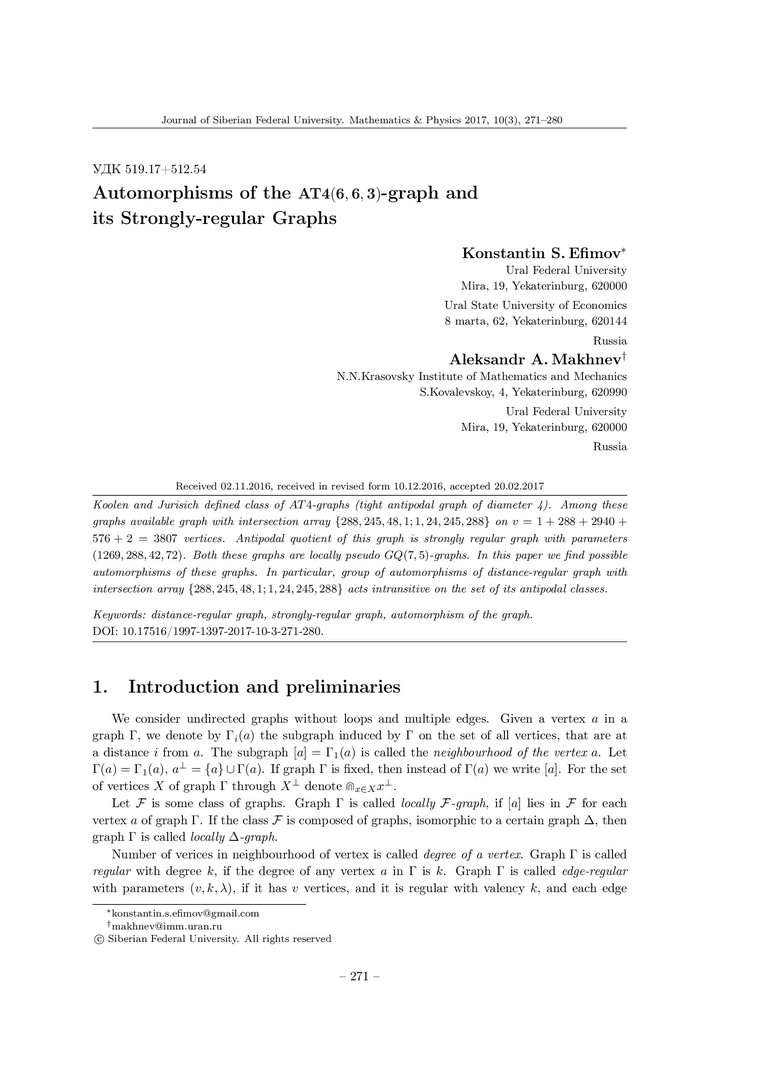Библиографическое описание:Efimov, Konstantin. Automorphisms of the AT4(6; 6; 3)-graph and its Strongly-regular Graphs = Автоморфизмы AT4(6; 6; 3)-графа и отвечающих ему сильно регулярных графов / K. S. Efimov, A. A. Makhnev. - Текст : непосредственный // Журнал Сибирского федерального университета. Математика и физика. - 2017. - Т. 10, № 3. - С. 271-280. - Библиогр.: с. 279-280. - ISSN 1997-1397.