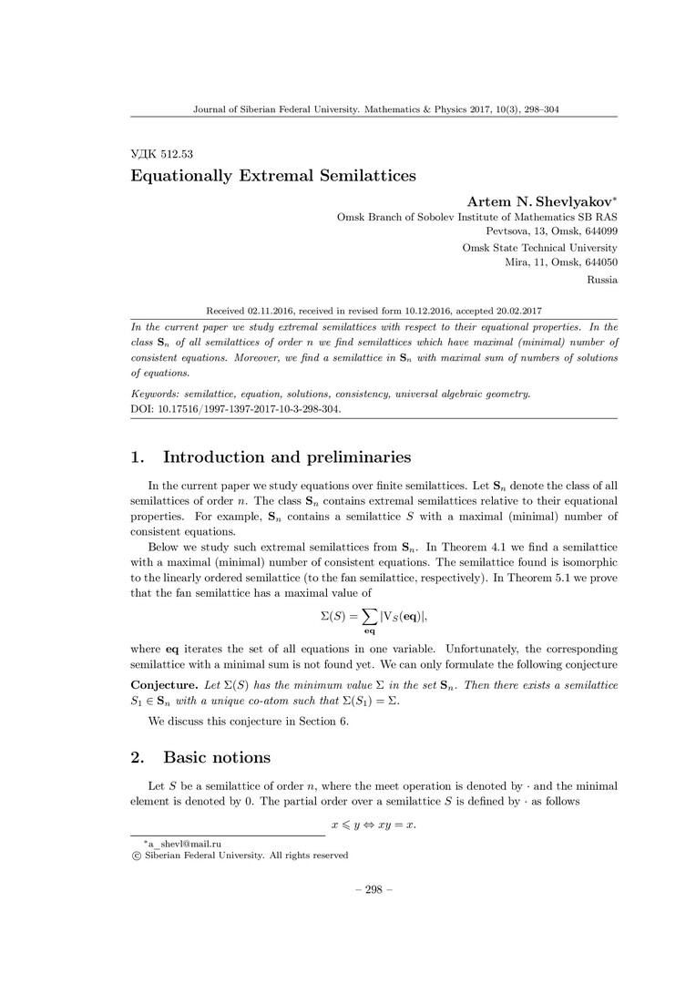 Библиографическое описание:Shevlyakov, Artem. Equationally Extremal Semilattices = Эквационально экстремальные полурешетки / A. N. Shevlyakov. - Текст : непосредственный // Журнал Сибирского федерального университета. Математика и физика. - 2017. - Т. 10, № 3. - С. 298-304. - Библиогр.: с. 304. - ISSN 1997-1397.