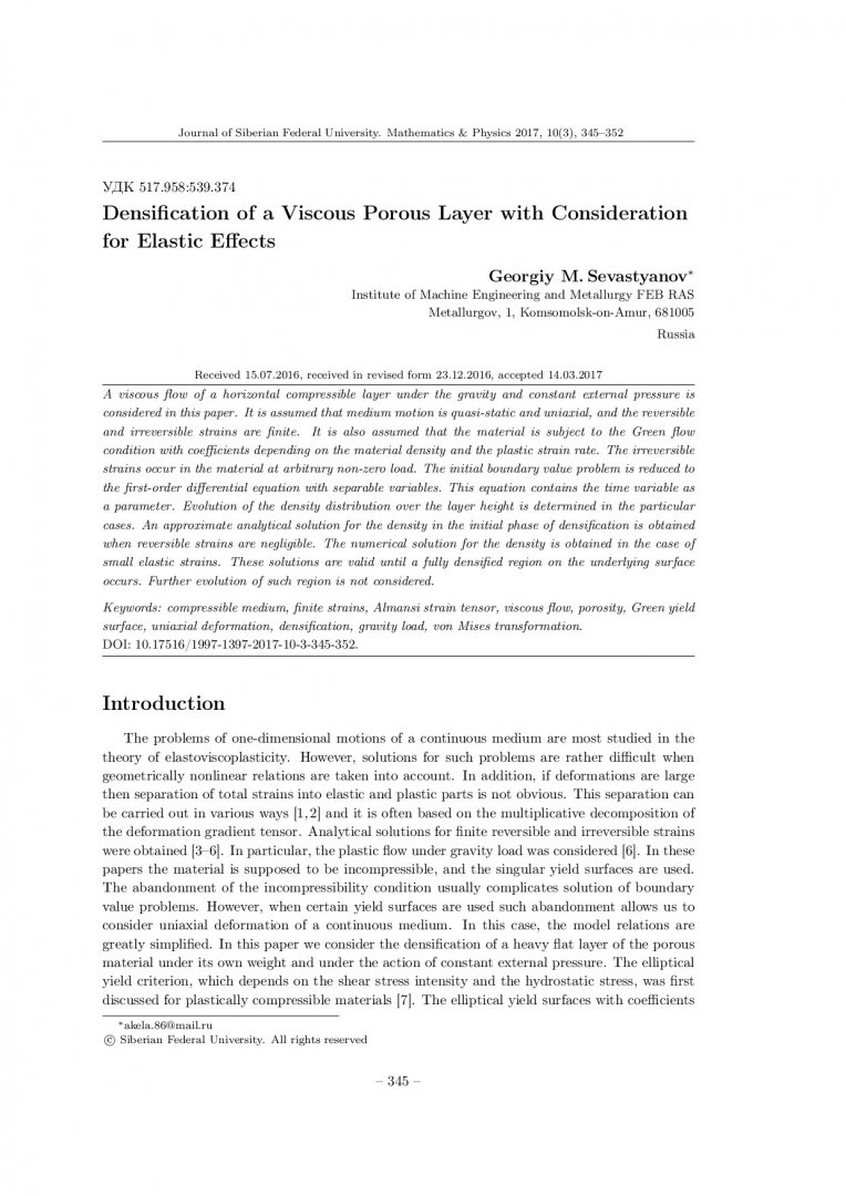 Библиографическое описание:Sevastyanov, Georgiy. Densification of a Viscous Porous Layer with Consideration for Elastic Effects = Вязкое уплотнение тяжелого пористого слоя с учетом упругих эффектов / G. M. Sevastyanov. - Текст : непосредственный // Журнал Сибирского федерального университета. Математика и физика. - 2017. - Т. 10, № 3. - С. 345-352. - Библиогр.: с. 351-352. - ISSN 1997-1397.