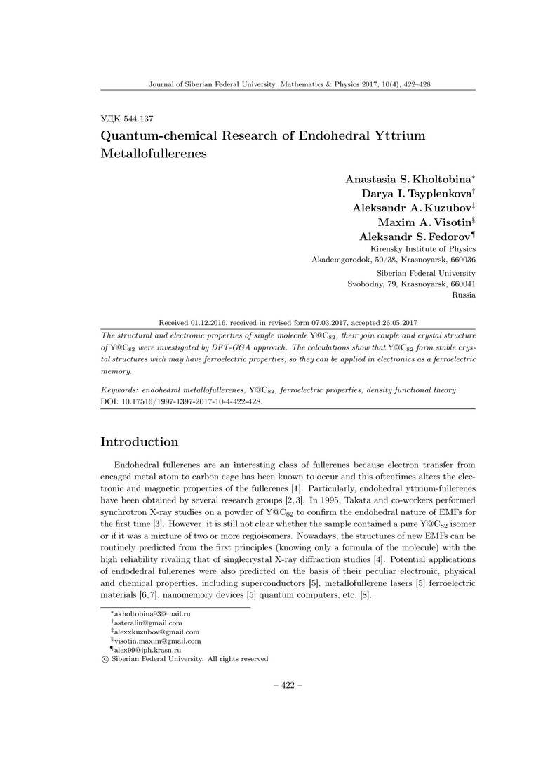 Библиографическое описание:Quantum-chemical Research of Endohedral Yttrium Metallofullerenes = Квантово-химическое исследование эндоэдральных иттриевых металлофуллеренов / A. S. Kholtobina [et al.]. - Текст : непосредственный // Журнал Сибирского федерального университета. Математика и физика. - 2017. - Т. 10, № 4. - С. 422-428. - Библиогр.: с. 427-428. - ISSN 1997-1397.