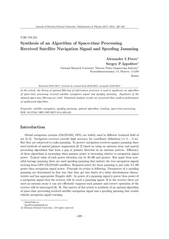 Библиографическое описание:Perov, Alexander. Synthesis of an Algorithm of Space-time Processing Received Satellite Navigation Signal and Spoofing Jamming = Синтез оптимального алгоритма пространственно- временной обработки спутникового навигационного сигнала и сигнала имитационной помехи / A. I. Perov, S. P. Ippolitov. - Текст : непосредственный // Журнал Сибирского федерального университета. Математика и физика. - 2017. - Т. 10, № 4. - С. 429-442. - Библиогр.: с. 441-442. - ISSN 1997-1397.