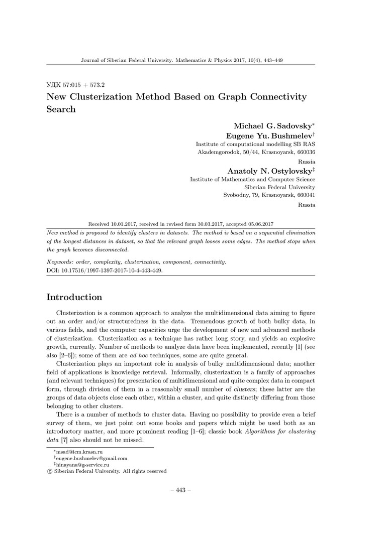 Библиографическое описание:Sadovsky, Michael. New Clusterization Method Based on Graph Connectivity Search = Новый метод кластеризации на основе поиска связности графа / M. G. Sadovsky, E. Yu. Bushmelev, A. N. Ostylovsky. - Текст : непосредственный // Журнал Сибирского федерального университета. Математика и физика. - 2017. - Т. 10, № 4. - С. 443-449. - Библиогр.: с. 448. - ISSN 1997-1397.