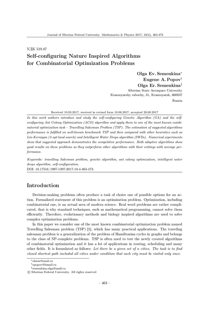 Библиографическое описание:Semenkina, Olga. Self-configuring Nature Inspired Algorithms for Combinatorial Optimization Problems = Самоконфигурируемые алгоритмы для задач комбинаторной оптимизации / O. E. Semenkina, E. A. Popov, O. E. Semenkina. - Текст : непосредственный // Журнал Сибирского федерального университета. Математика и физика. - 2017. - Т. 10, № 4. - С. 463-473. - Библиогр.: с. 473. - ISSN 1997-1397.