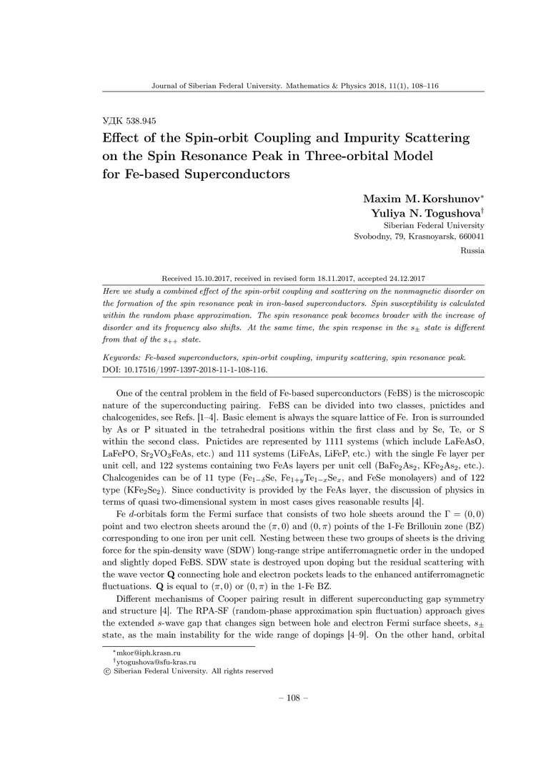 Библиографическое описание:Korshunov, Maxim. Effect of the Spin-orbit Coupling and Impurity Scattering on the Spin Resonance Peak in Three-orbital Model for Fe-based Superconductors = Влияние спин-орбитального взаимодействия и рассеяния на примесях на спин-резонансный пик в трёхорбитальной модели сверхпроводников на основе железа / M. M. Korshunov, Yu. N. Togushova. - Текст : непосредственный // Журнал Сибирского федерального университета. Математика и физика. - 2018. - Т. 11, № 1. - С. 108-116. - Библиогр.: с. 116. - ISSN 1997-1397.