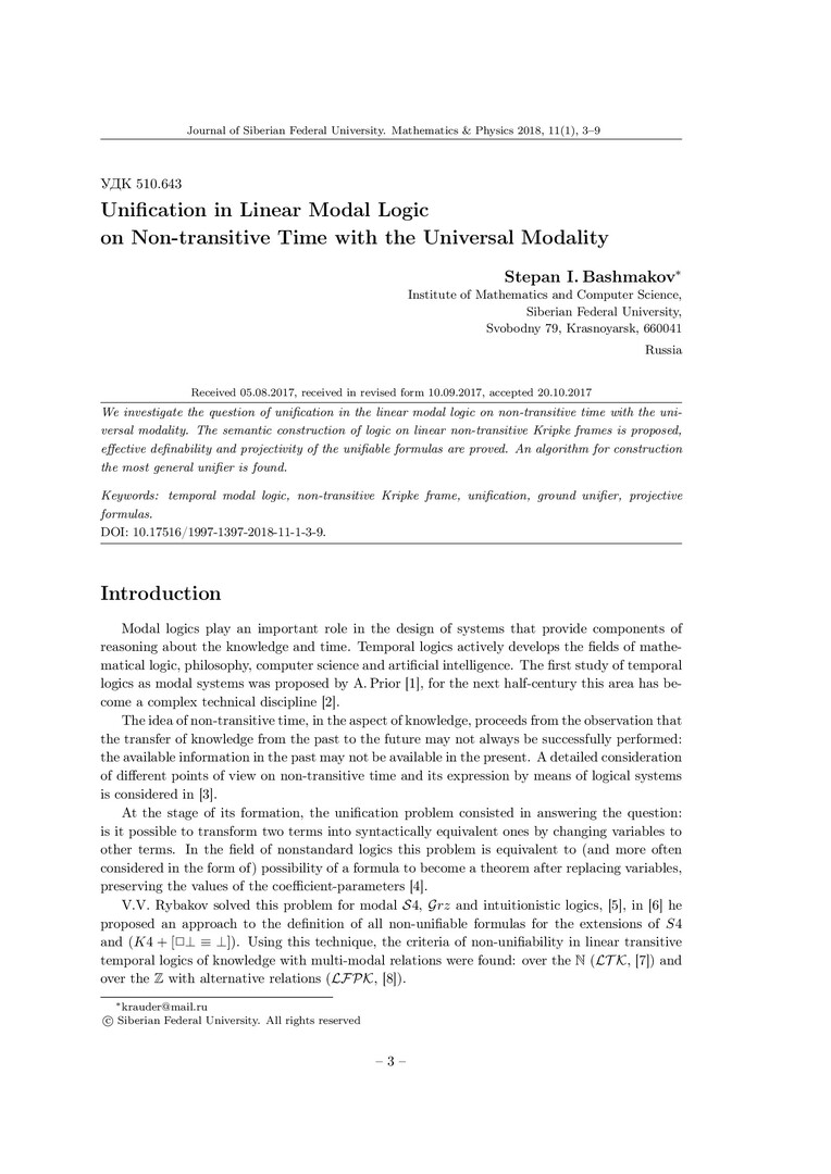 Библиографическое описание:Bashmakov, Stepan. Unification in Linear Modal Logic on Non-transitive Time with the Universal Modality = Унификация в линейной модальной логике нетранзитивного времени с универсальной модальностью / S. I. Bashmakov. - Текст : непосредственный // Журнал Сибирского федерального университета. Математика и физика. - 2018. - Т. 11, № 1. - С. 3-9. - Библиогр.: с. 9. - ISSN jsff.