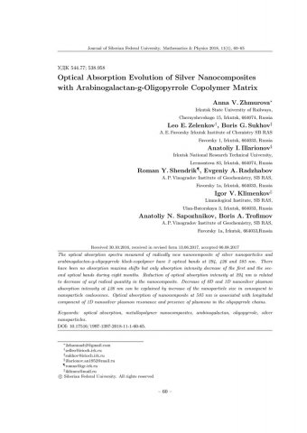 Библиографическое описание:Optical Absorption Evolution of Silver Nanocomposites with Arabinogalactan-g-Oligopyrrole Copolymer Matrix = Эволюция оптического поглощения нанокомпозитов серебра с сополимерной матрицей арабиногалактан-олигопиррол / A. V. Zhmurova [et al.]. - Текст : непосредственный // Журнал Сибирского федерального университета. Математика и физика. - 2018. - Т. 11, № 1. - С. 60-65. - Библиогр.: с. 65. - ISSN 1997-1397.