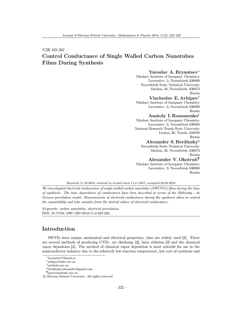 Библиографическое описание:Control Conductance of Single Walled Carbon Nanotubes Films During Synthesis = Контроль электропроводности пленок однослойных углеродных нанотрубок в процессе синтеза / Ya. A. Bryantsev [и др.]. - Текст : непосредственный // Журнал Сибирского федерального университета. Математика и физика. - 2018. - Т. 11, № 2. - С. 222–226. - Библиогр.: с. 225-226. - ISSN 1997-1397.