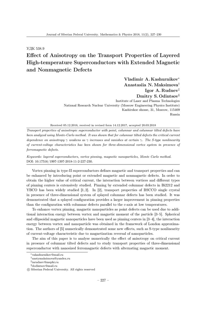 Аннотация:Методом Монте-Карло проанализированы транспортные свойства анизотропного сверхпроводника с точечными, колумнарными и колумнарными наклонными дефектами. Показано, что в случае колумнарных наклонных дефектов зависимость критического тока от анизотропии ослабевает с ростом и при определенном исчезает совсем.