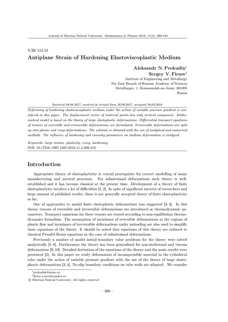 Библиографическое описание:Prokudin, Aleksandr. Antiplane Strain of Hardening Elastoviscoplastic Medium = Антиплоская деформация упрочняющейся упруговязкопластической среды / A. N. Prokudin, S. V. Firsov. - Текст : непосредственный // Журнал Сибирского федерального университета. Математика и физика. - 2018. - Т. 11, № 4. - С. 399-410. - Библиогр.: с. 409-410. - ISSN 1997-1397.