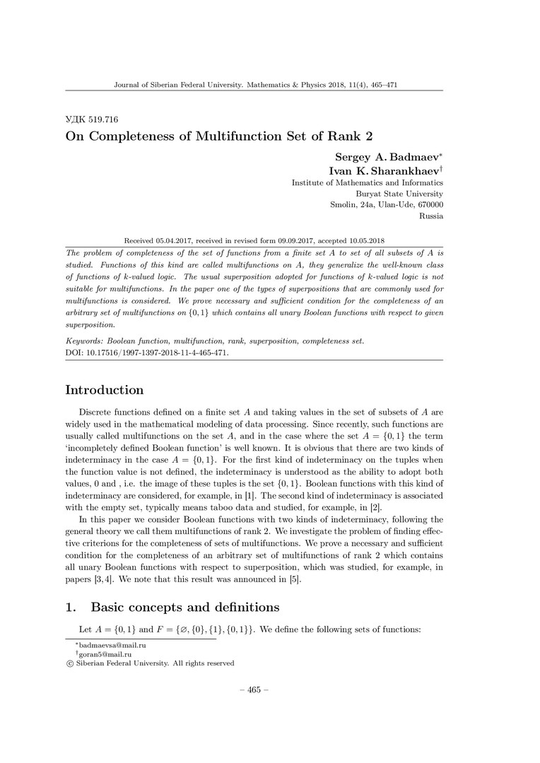 Библиографическое описание:Badmaev, Sergey. On Completeness of Multifunction Set of Rank 2 = О полноте множества мультифункций ранга 2 / S. A. Badmaev, I. K. Sharankhaev. - Текст : непосредственный // Журнал Сибирского федерального университета. Математика и физика. - 2018. - Т. 11, № 4. - С. 465–471. - Библиогр.: с. 470-471. - ISSN 1997-1397.