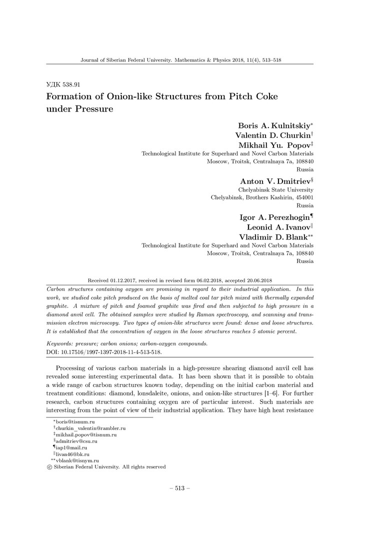 Библиографическое описание:Formation of Onion-like Structures from Pitch Coke under Pressure = Образование онионоподобных структур из пекового кокса под давлением / B. A. Kulnitskiy [и др.]. - Текст : непосредственный // Журнал Сибирского федерального университета. Математика и физика. - 2018. - Т. 11, № 4. - С. 513–518. - Библиогр.: с. 517-518. - ISSN 1997-1397.