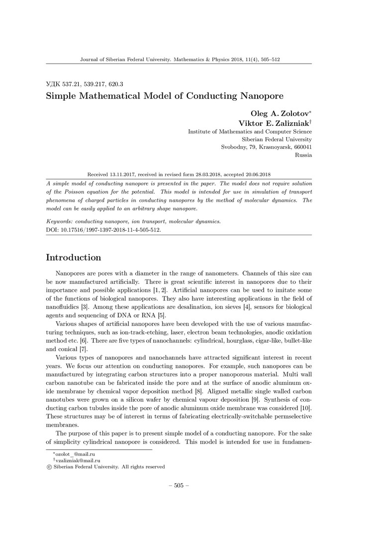Библиографическое описание:Zolotov, Oleg. Simple Mathematical Model of Conducting Nanopore = Простая математическая модель проводящей нанопоры / O. A. Zolotov, V. E. Zalizniak. - Текст : непосредственный // Журнал Сибирского федерального университета. Математика и физика. - 2018. - Т. 11, № 4. - С. 505–512. - Библиогр.: с. 511-512. - ISSN 1997-1397.