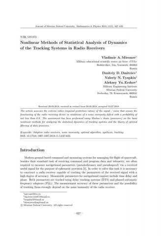 Библиографическое описание:Nonlinear Methods of Statistical Analysis of Dynamics of the Tracking Systems in Radio Receivers = Нелинейные методы статистического анализа динамики следящих систем радиоприемных устройств / V. A. Mironov [и др.]. - Текст : непосредственный // Журнал Сибирского федерального университета. Математика и физика. - 2018. - Т. 11, № 5. - С. 627–633. - Библиогр.: с. 633. - ISSN 1997-1397.