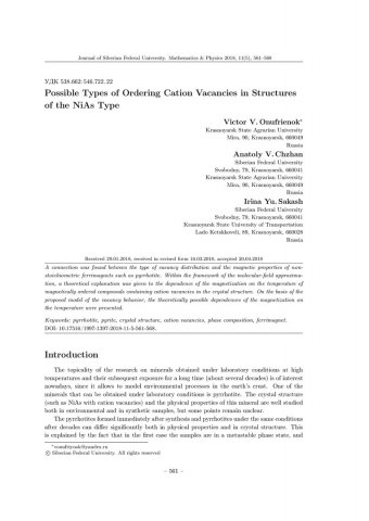 Библиографическое описание:Onufrienok, Victor. Possible Types of Ordering Cation Vacancies in Structures of the NiAs Type = Возможные типы упорядочения катионных вакансий в структурах типа NiAs / V. V. Onufrienok , A. V. Chzhan, I. Yu. Sakash. - Текст : непосредственный // Журнал Сибирского федерального университета. Математика и физика. - 2018. - Т. 11, № 5. - С. 561–568. - Библиогр.: с. 567-568. - ISSN 1997-1397.