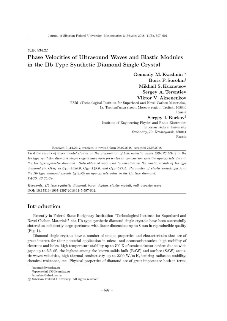 Библиографическое описание:Phase Velocities of Ultrasound Waves and Elastic Modules in the IIb Type Synthetic Diamond Single Crystal = Фазовые скорости ультразвуковых волн и упругие модули синтетического монокристалла алмаза IIb типа / G. M. Kvashnin [и др.]. - Текст : непосредственный // Журнал Сибирского федерального университета. Математика и физика. - 2018. - Т. 11, № 5. - С. 597–602. - Библиогр.: с. 601-602. - ISSN 1997-1397.