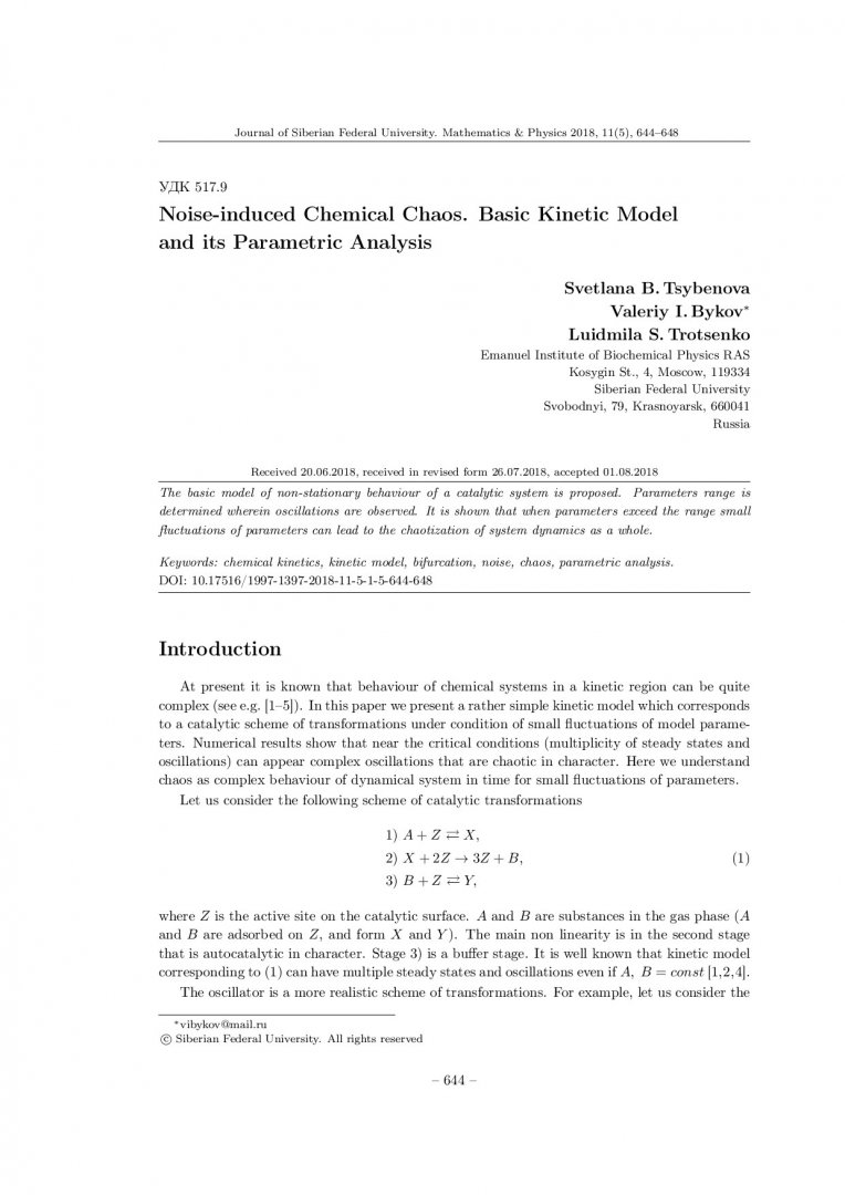 Библиографическое описание:Tsybenova, Svetlana. Noise-induced Chemical Chaos. Basic Kinetic Model and its Parametric Analysis = Химический "хаос", индуцированный шумом. Базовая кинетическая модель и ее параметрический анализ / S. B. Tsybenova, V. I. Bykov. - Текст : непосредственный // Журнал Сибирского федерального университета. Математика и физика. - 2018. - Т. 11, № 5. - С. 644–648. - Библиогр.: с. 648. - ISSN 1997-1397.