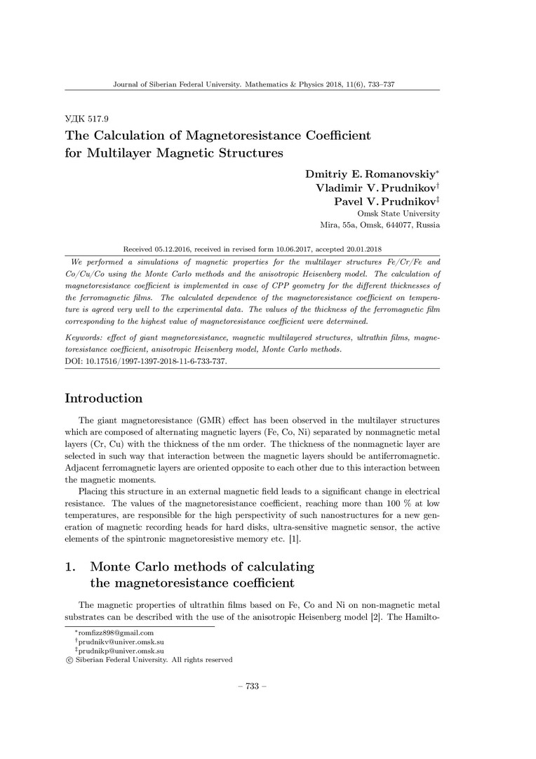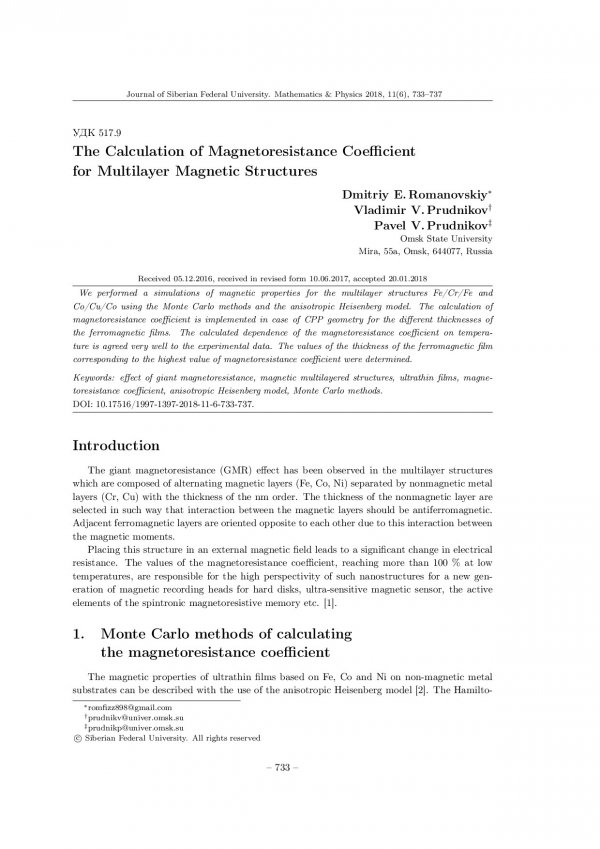 Библиографическое описание:Romanovskiy, Dmitriy. The Calculation of Magnetoresistance Coefficient for Multilayer Magnetic Structures = Расчет коэффициента магнитосопротивления мультислойных магнитных структур / D. E. Romanovskiy, V. V. Prudnikov, P. V. Prudnikov. - Текст : непосредственный // Журнал Сибирского федерального университета. Математика и физика. - 2018. - Т. 11, № 6. - С. 733–737. - Библиогр.: с. 736-737. - ISSN 1997-1397.