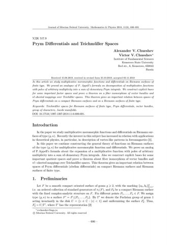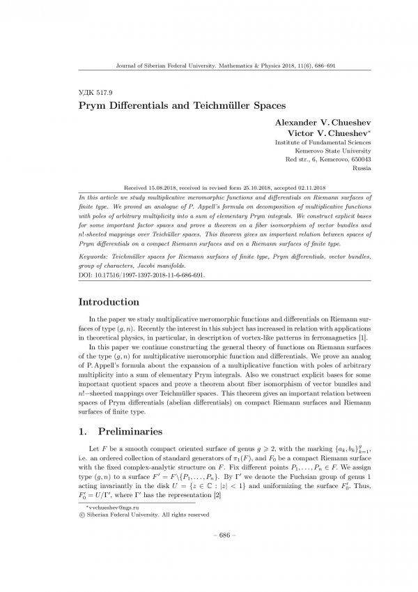 Библиографическое описание:Chueshev, Alexander. Prym Differentials and Teichm uller Spaces = Дифференциалы Прима и пространства Тейхмюллера / A. V. Chueshev, V. V. Chueshev. - Текст : непосредственный // Журнал Сибирского федерального университета. Математика и физика. - 2018. - Т. 11, № 6. - С. 686–691. - Библиогр.: с. 690-691. - ISSN 1997-1397.