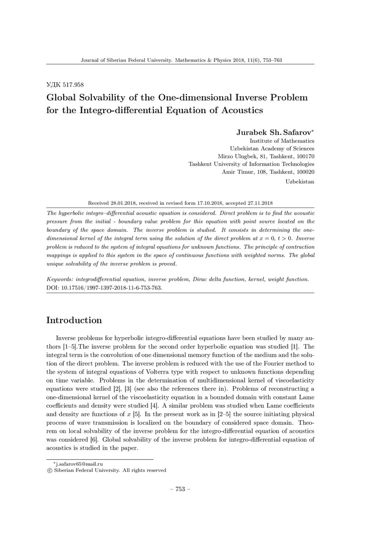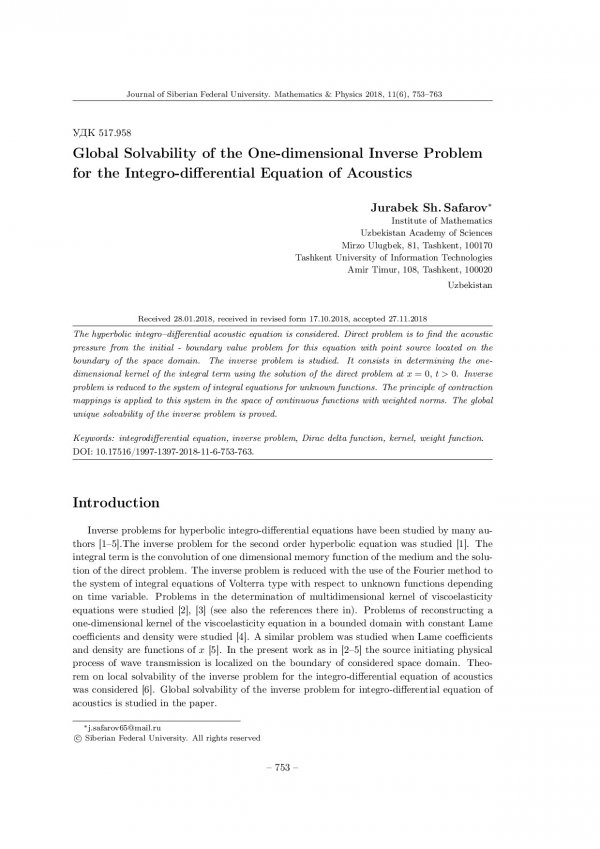 Библиографическое описание:Safarov, Jurabek. Global Solvability of the One-dimensional Inverse Problem for the Integro-differential Equation of Acoustics = Глобальная разрешимость одномерной обратной задачи для интегродифференциального уравнения акустики / Ju. Sh. Safarov. - Текст : непосредственный // Журнал Сибирского федерального университета. Математика и физика. - 2018. - Т. 11, № 6. - С. 753–763. - Библиогр.: с. 762-763. - ISSN 1997-1397.