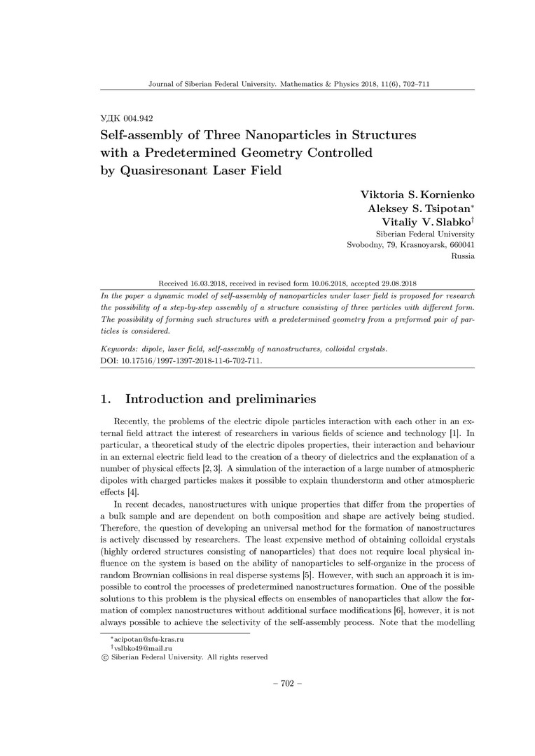 Библиографическое описание:Kornienko, Viktoria. Self-assembly of Three Nanoparticles in Structures with a Predetermined Geometry Controlled by Quasiresonant Laser Fied = Самосборка структур, состоящих из трех наночастиц, с заранее заданной геометрией под действием квазирезонансного лазерного излучения / V. S. Kornienko, A. S. Tsipotan [и др.]. - Текст : непосредственный // Журнал Сибирского федерального университета. Математика и физика. - 2018. - Т. 11, № 6. - С. 702–711. - Библиогр.: с. 710-711. - ISSN 1997-1397.