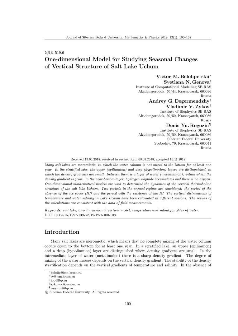 Библиографическое описание:One-dimensional Model for Studying Seasonal Changes of Vertical Structure of Salt Lake Uchum = Одномерная модель для исследования сезонных изменений вертикальной структуры соленого озера Учум / V. M. Belolipetskii [и др.]. - Текст : непосредственный // Журнал Сибирского федерального университета. Математика и физика. - 2019. - Т. 12, № 1. - С. 100–108. - Библиогр.: с. 107-108. - ISSN 1997-1397.