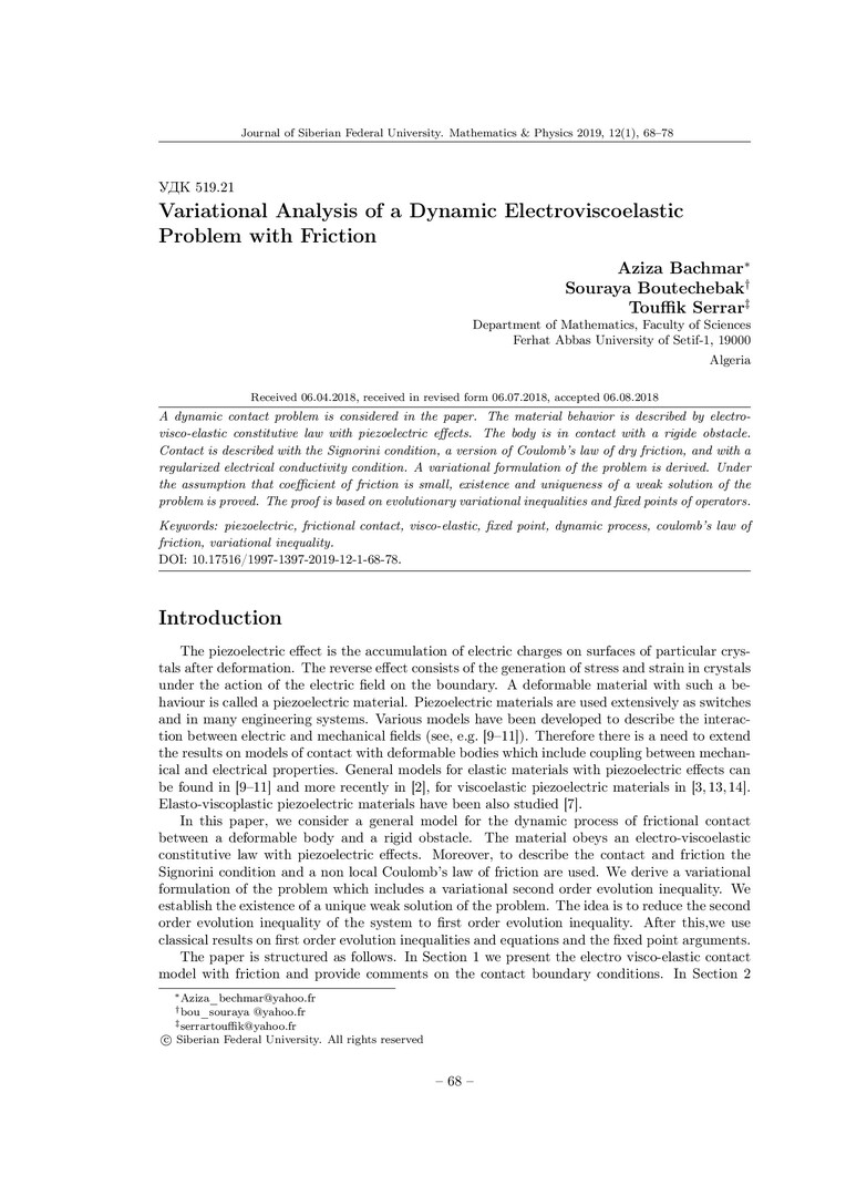 Библиографическое описание:Bachmar, Aziza. Variational Analysis of a Dynamic Electroviscoelastic Problem with Friction = Вариационный анализ динамической электро-вязкоупругой задачи с трением / A. Bachmar, S. Boutechebak, T. Serrar. - Текст : непосредственный // Журнал Сибирского федерального университета. Математика и физика. - 2019. - Т. 12, № 1. - С. 68–78. - ISSN 1997-1397.
