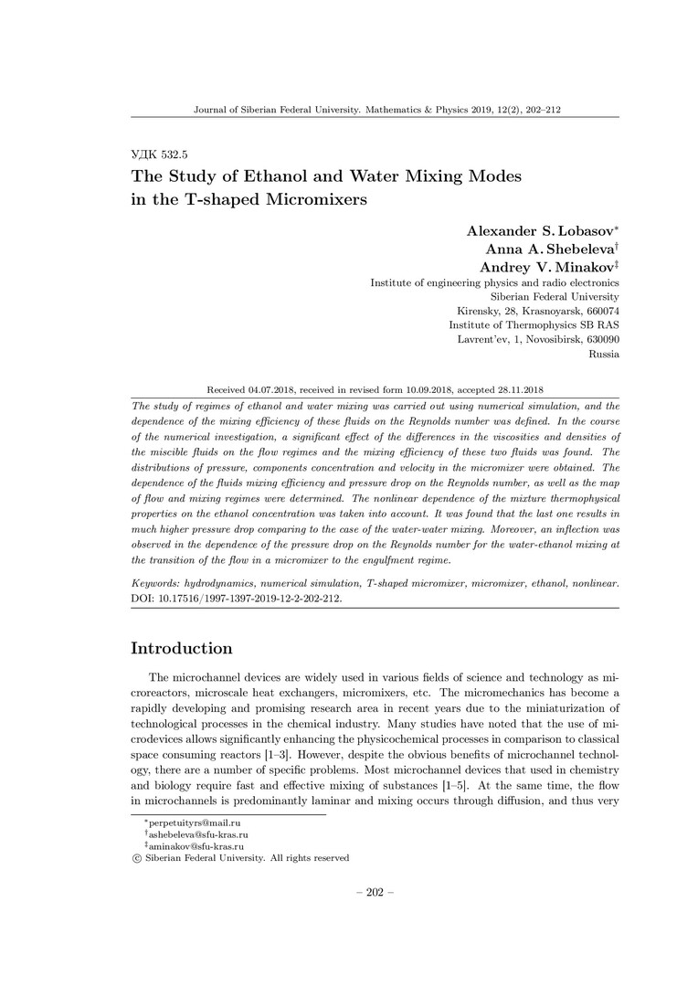 Библиографическое описание:Lobasov, Alexander. The Study of Ethanol and Water Mixing Modes in the T-shaped Micromixers = Изучение режимов смешения воды и этанола в Т-образных микромиксерах / A. S. Lobasov, A. A. Shebeleva. - Текст : непосредственный // Журнал Сибирского федерального университета. Математика и физика. - 2019. - Т. 12, № 2. - С. 202–212. - Библиогр.: с. 210-212. - ISSN 1997-1397.
