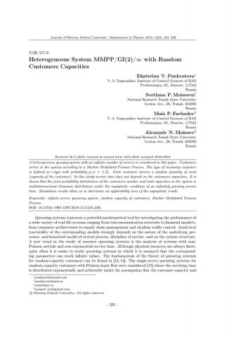 Библиографическое описание:Heterogeneous System MMPP/GI(2)/символ бесконечности with Random Customers Capacities = Ресурсные неоднородные СМО MMPP/GI(2)/символ бесконечности / E. V. Pankratova [и др.]. - Текст : непосредственный // Журнал Сибирского федерального университета. Математика и физика. - 2019. - Т. 12, № 2. - С. 231–239. - Библиогр.: с. 238-239. - ISSN 1997-1397.