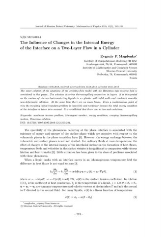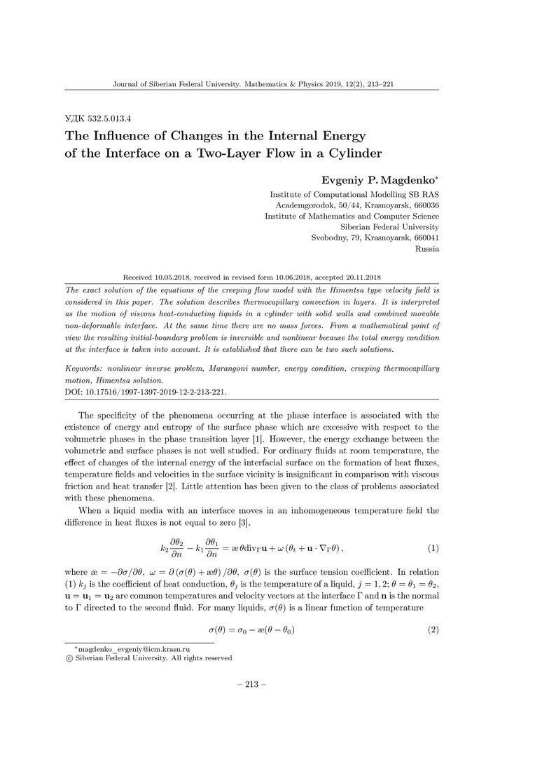 Библиографическое описание:Magdenko, Evgeniy. The Influence of Changes in the Internal Energy of the Interface on a Two-Layer Flow in a Cylinder = Влияние изменений внутренней энергии поверхности раздела на двухслойное течение в цилиндре / E. P. Magdenko. - Текст : непосредственный // Журнал Сибирского федерального университета. Математика и физика. - 2019. - Т. 12, № 2. - С. 213–221. - Библиогр.: с. 220-221. - ISSN 1997-1397.
