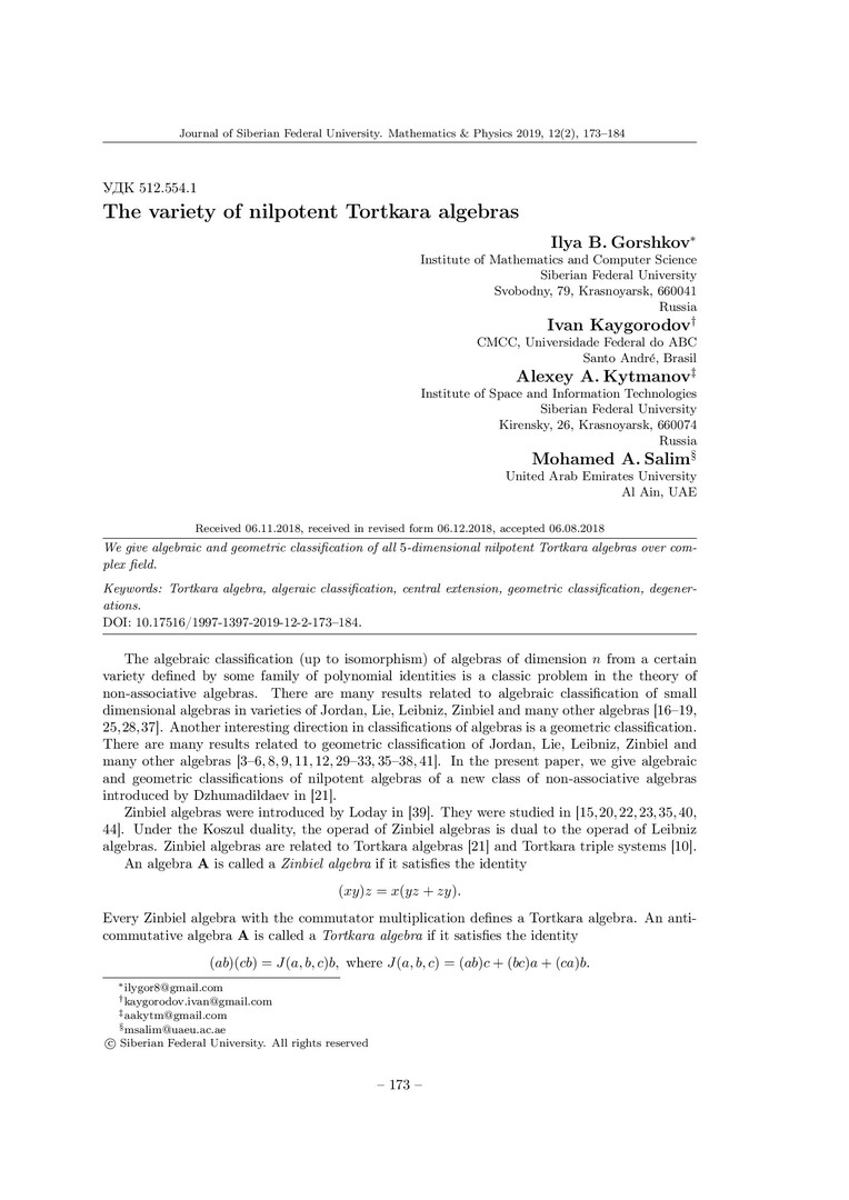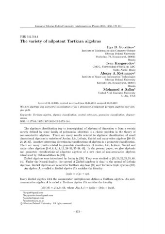 Библиографическое описание:The Variety of Nilpotent Tortkara Algebras = Многоообразие нильпотентных алгебр Торткара / I. B. Gorshkov [и др.]. - Текст : непосредственный // Журнал Сибирского федерального университета. Математика и физика. - 2019. - Т. 12, № 2. - С. 173–184. - Библиогр.: с. 181-184. - ISSN 1997-1397.
