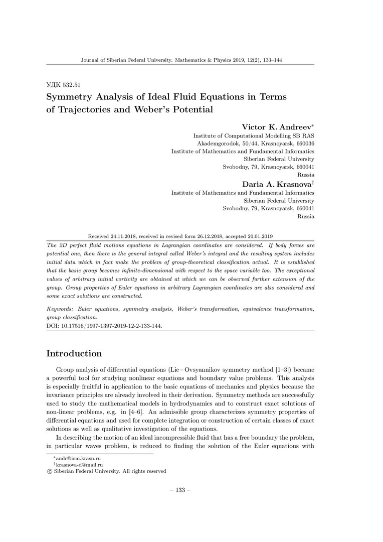 Библиографическое описание:Andreev, Victor. Symmetry Analysis of Ideal Fluid Equations in Terms of Trajectories and Weber`s Potential = Симметрийный анализ уравнений идеальной жидкости в терминах траектории – потенциал Вебера / V. K. Andreev, D. A. Krasnova. - Текст : непосредственный // Журнал Сибирского федерального университета. Математика и физика. - 2019. - Т. 12, № 2. - С. 133–144. - Библиогр.: с. 143-144. - ISSN 1997-1397.