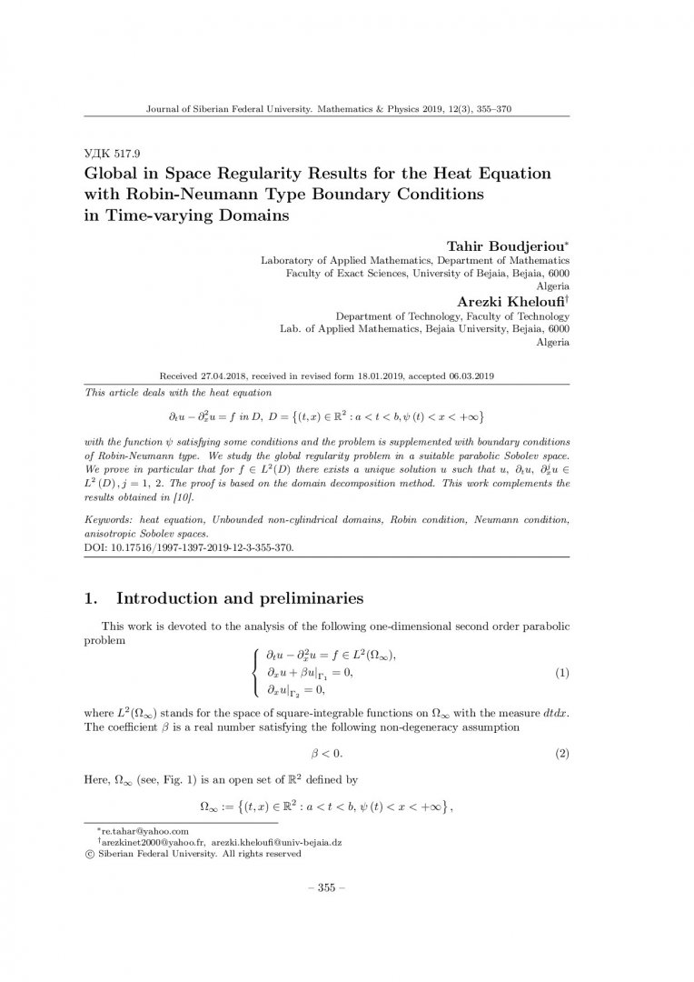 Библиографическое описание:Boudjeriou, Tahir. Global in Space Regularity Results for the Heat Equation with Robin-Neumann Type Boundary Conditions in Time-varying Domains = Результаты исследования регулярности в пространстве для уравнения теплопроводности с граничными условиями типа Робина-Неймана в изменяющихся во времени областях / T. Boudjeriou, A. Kheloufi. - Текст : непосредственный // Журнал Сибирского федерального университета. Математика и физика. - 2019. - Т. 12, № 3. - С. 355–370. - Библиогр.: с. 369-370. - ISSN 1997-1397.