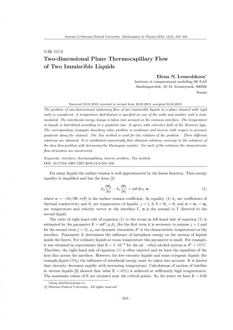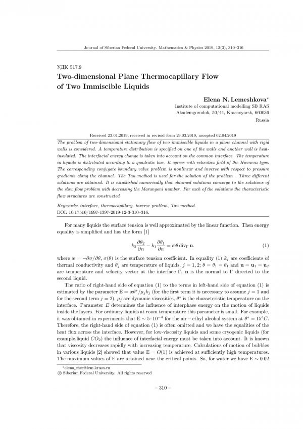 Библиографическое описание:Lemeshkova, Elena. Two-dimensional Plane Thermocapillary Flow of Two Immiscible Liquids = Двумерное плоское термокапиллярное течение двух несмешивающихся жидкостей / E. N. Lemeshkova. - Текст : непосредственный // Журнал Сибирского федерального университета. Математика и физика. - 2019. - Т. 12, № 3. - С. 310–316. - Библиогр.: с. 315-316. - ISSN 1997-1397.