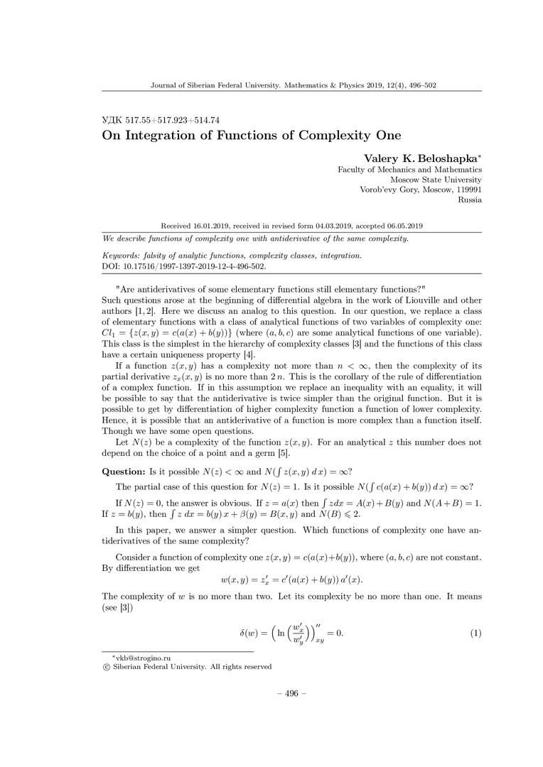 Библиографическое описание:Beloshapka, Valery. On Integration of Functions of Complexity One = Об интегрировании функций сложности 1 / V. K. Beloshapka. - Текст : непосредственный // Журнал Сибирского федерального университета. Математика и физика. - 2019. - Т. 12, № 4. - С. 496-502. - Библиогр.: с. 501-502. - ISSN 1997-1397.