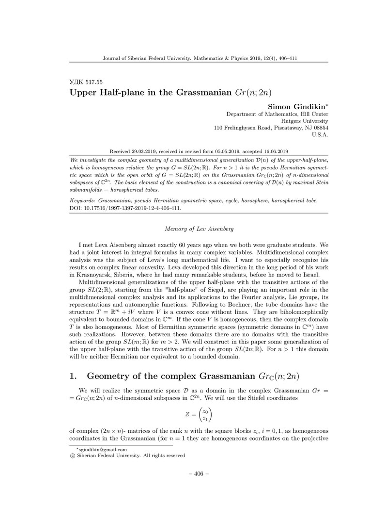 Библиографическое описание:Gindikin, Simon. Upper Half-plane in the Grassmanian Gr(n; 2n) = Верхняя полуплоскость в грассманиане Gr(n; 2n) / S. Gindikin. - Текст : непосредственный // Журнал Сибирского федерального университета. Математика и физика. - 2019. - Т. 12, № 4. - С. 406-411. - Библиогр.: с. 411. - ISSN 1997-1397.