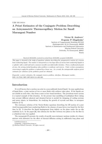 Библиографическое описание:Andreev, Victor K... A Priori Estimates of the Conjugate Problem Describing an Axisymmetric Thermocapillary Motion for Small Marangoni Number = Априорные оценки сопряженной задачи, описывающей осесимметричное термокапиллярное движение при малых числах Марангони / V. K. Andreev, E. P. Magdenko. - Текст : непосредственный // Журнал Сибирского федерального университета. Математика и физика. - 2019. - Т. 12, № 4. - С. 483-495. - Библиогр.: с. 494-495. - ISSN 1997-1397.