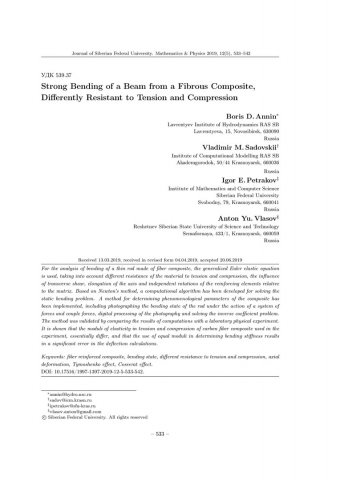 Библиографическое описание:Strong Bending of a Beam from a Fibrous Composite, Differently Resistant to Tension and Compression = Сильный изгиб стержня из волокнистого композита, по-разному сопротивляющегося растяжению и сжатию / B. D. Annin [и др.]. - Текст : непосредственный // Журнал Сибирского федерального университета. Математика и физика. - 2019. - Т. 12, № 5. - С. 533-542. - Библиогр.: с. 541-542. - ISSN 1997-1397.