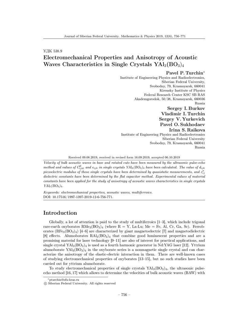 Библиографическое описание:Electromechanical Properties and Anisotropy of Acoustic Waves Characteristics in Single Crystals YAl[3](BO[3])[4] = Электромеханические свойства и анизотропия характеристик акустических волн в монокристаллах YAl[3](BO[3])[4] / P. P. Turchin [и др.]. - Текст : непосредственный // Журнал Сибирского федерального университета. Математика и физика. - 2019. - Т. 12, № 6. - С. 756-771. - Библиогр.: с. 769-771. - ISSN 1997-1397.