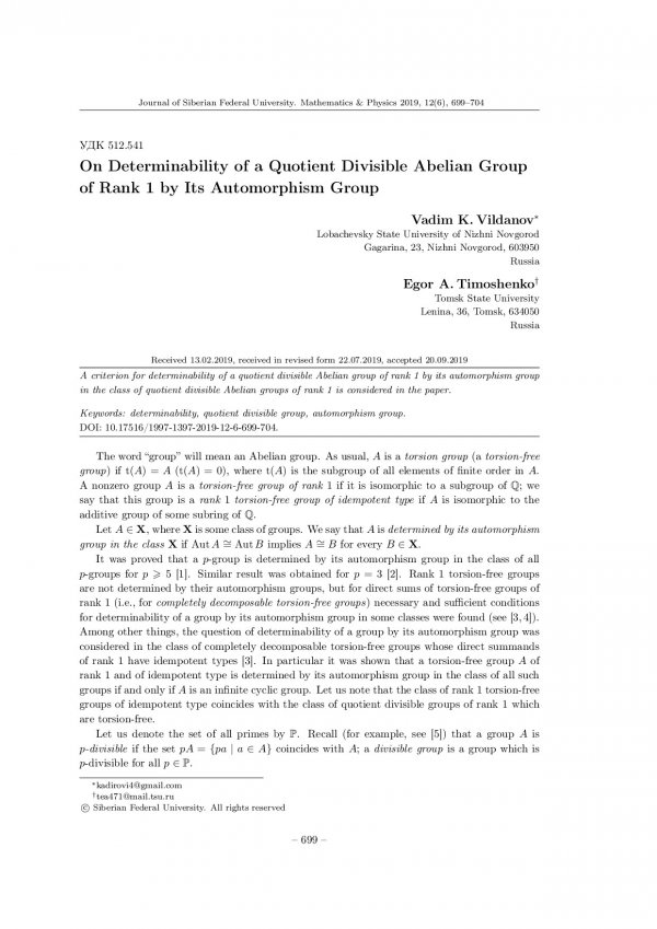 Библиографическое описание:Vildanov, Vadim. On Determinability of a Quotient Divisible Abelian Group of Rank 1 by Its Automorphism Group = Об определяемости факторно делимой абелевой группы ранга 1 своей группой автоморфизмов / V. K. Vildanov, E. A. Timoshenko. - Текст : непосредственный // Журнал Сибирского федерального университета. Математика и физика. - 2019. - Т. 12, № 6. - С. 699-704. - Библиогр.: с. 703. - ISSN 1997-1397.