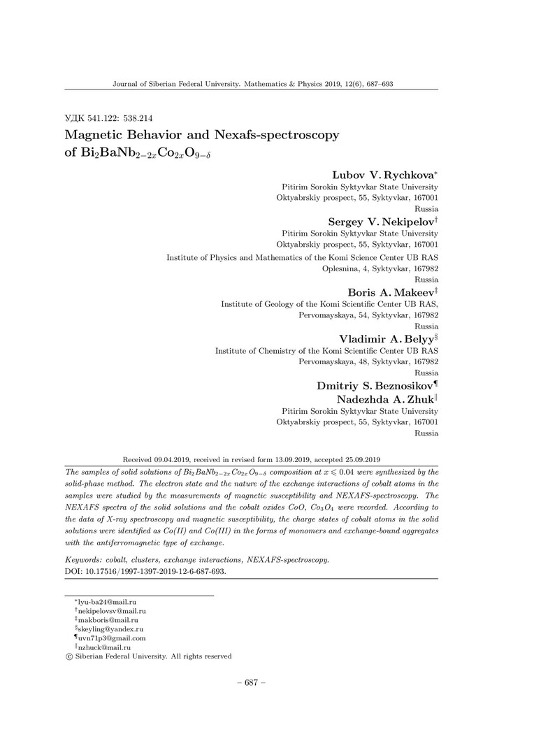 Библиографическое описание:Magnetic Behavior and Nexafs-spectroscopy of Bi[2]BaNb[2-2x]Сo[2x]O[9]?дельта = Магнитное поведение и NEXAFS-спектроскопия Bi[2]BaNb[2-2x]Сo[2x]O[9]?дельта / L. V. Rychkova [и др.]. - Текст : непосредственный // Журнал Сибирского федерального университета. Математика и физика. - 2019. - Т. 12, № 6. - С. 687-693. - Библиогр.: с. 691-692. - ISSN 1997-1397.