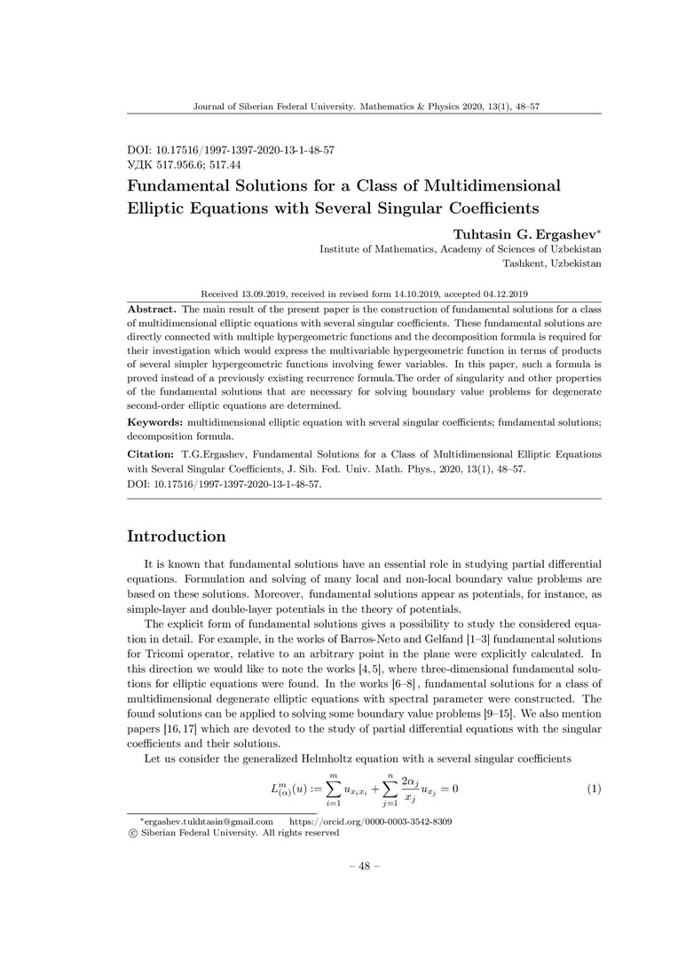 Библиографическое описание:Ergashev, Tuhtasin. Fundamental Solutions for a Class of Multidimensional Elliptic Equations with Several Singular Coefficients = Фундаментальные решения многомерного эллиптического уравнения с несколькими сингулярными коэффициентами / T. G. Ergashev. - Текст : непосредственный // Журнал Сибирского федерального университета. Математика и физика. - 2020. - Т. 13, № 1. - С. 48–57. - Библиогр.: с. 55-57. - ISSN 1997-1397.