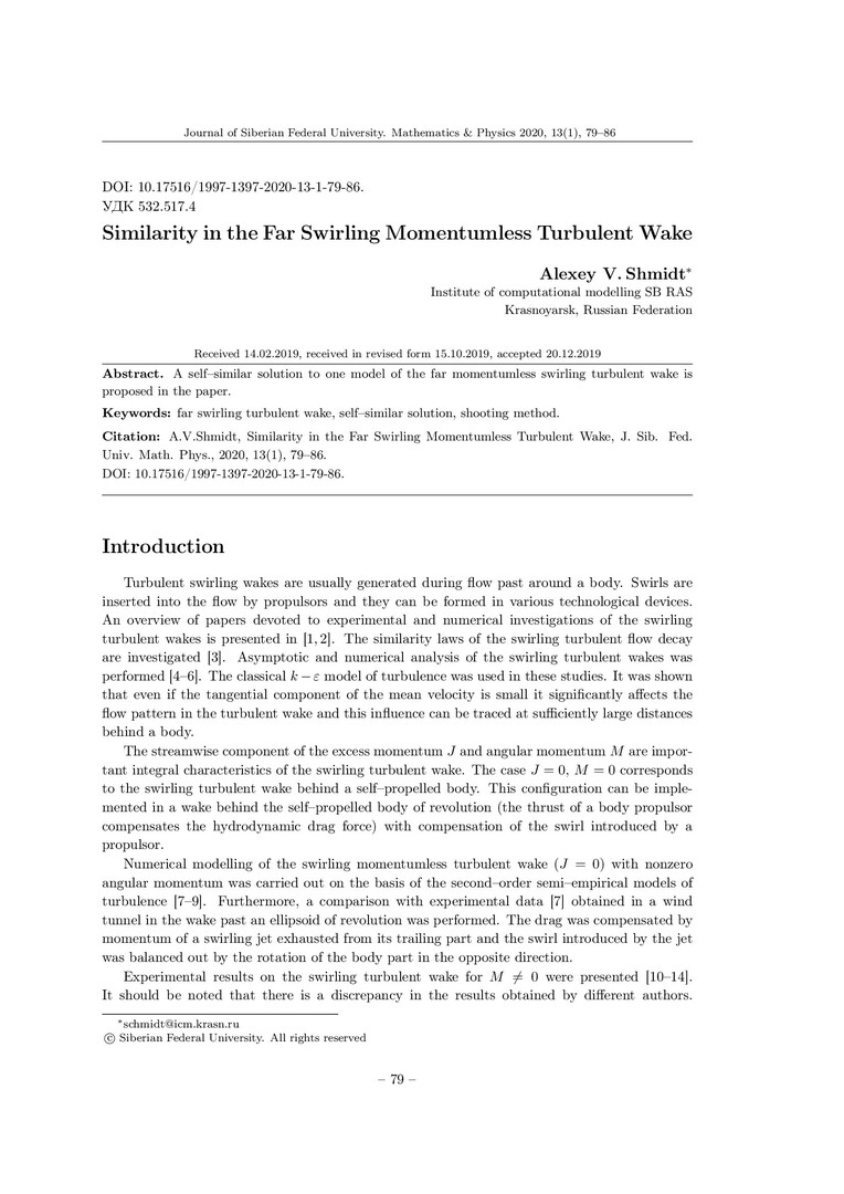 Библиографическое описание:Shmidt, Alexey. Similarity in the Far Swirling Momentumless TurbulentWake = Автомодельность дальнего закрученного безымпульсного турбулентного следа / A. V. Shmidt. - Текст : непосредственный // Журнал Сибирского федерального университета. Математика и физика. - 2020. - Т. 13, № 1. - С. 79–86. - Библиогр.: с. 84-86. - ISSN 1997-1397.