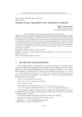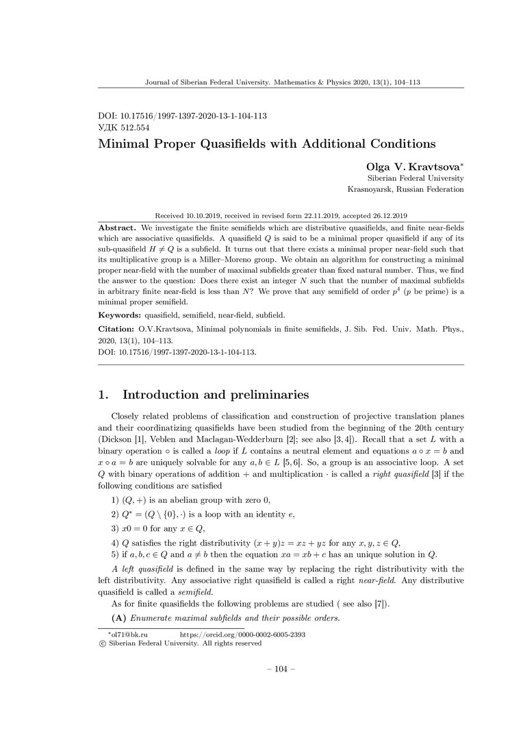 Библиографическое описание:Kravtsova, Olga. Minimal Proper Quasifields with Additional Conditions = Минимальные собственные квазиполя с дополнительными условиями / O. V. Kravtsova. - Текст : непосредственный // Журнал Сибирского федерального университета. Математика и физика. - 2020. - Т. 13, № 1. - С. 104–113. - Библиогр.: с. 112-113. - ISSN 1997-1397.