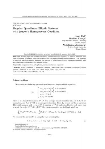Библиографическое описание:Didi, Hana. Singular Quasilinear Elliptic Systems with (super-) Homogeneous Condition = Сингулярные квазилинейные эллиптические системы с (супер-)однородным условием / H. Didi, B. Khodja, A. Moussaoui. - Текст : непосредственный // Журнал Сибирского федерального университета. Математика и физика. - 2020. - Т. 13, № 2. - С. 151–159. - Библиогр.: с. 158-159. - ISSN 1997-1397.
