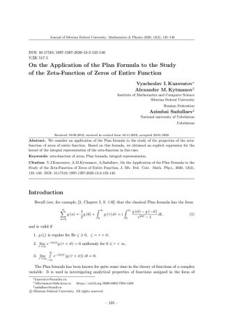Аннотация:В данной статье рассмотрено применение формулы Плана к исследованию свойств дзета-функции нулей целой функции. На основе данной формулы получено явное выражение для ядра интегрального представления дзета-функции в этом случае.