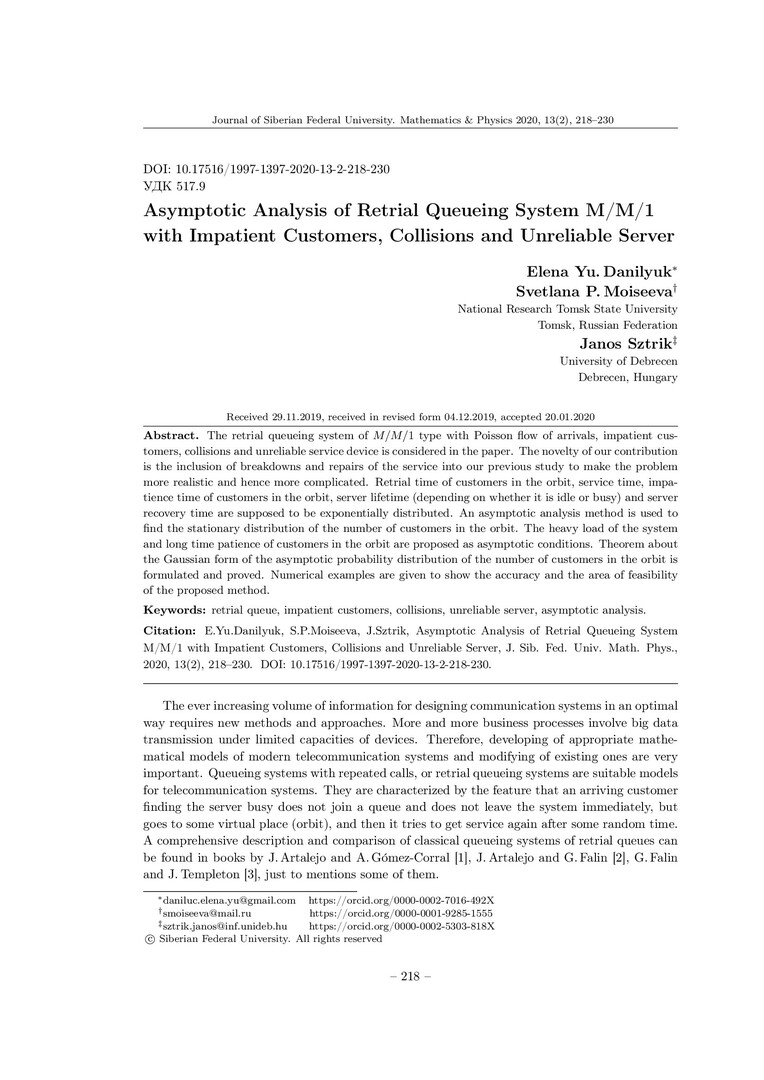 Библиографическое описание:Danilyuk, Elena. Asymptotic Analysis of Retrial Queueing System M/M/1 with Impatient Customers, Collisions and Unreliable Server = Асимптотический анализ системы массового обслуживания с повторными вызовами M/M/1 с нетерпеливыми заявками, конфликтами и ненадежным прибором / E. Yu. Danilyuk, S. P. Moiseeva , J. Sztrik. - Текст : непосредственный // Журнал Сибирского федерального университета. Математика и физика. - 2020. - Т. 13, № 2. - С. 218–230. - Библиогр.: с. 228-230. - ISSN 1997-1397.