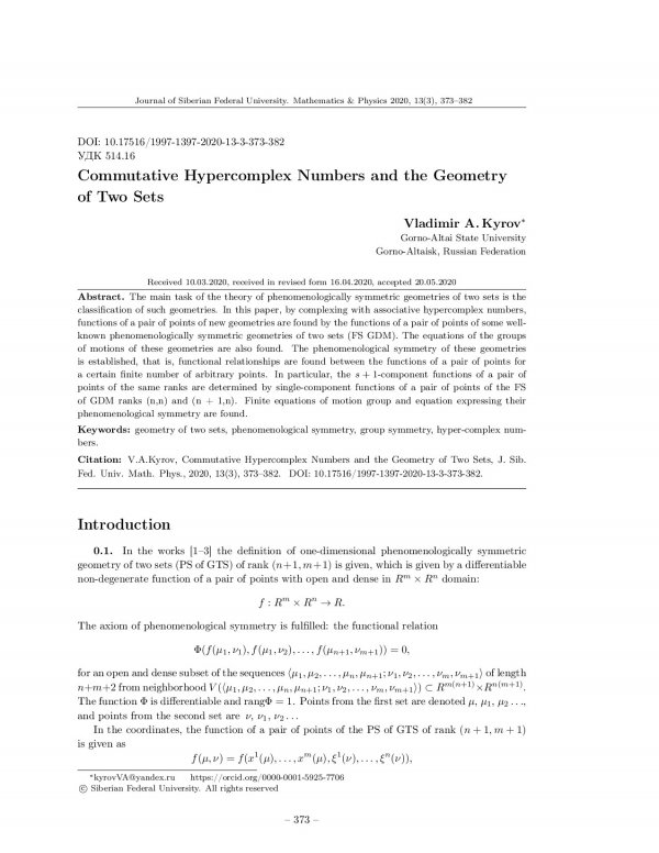 Библиографическое описание:Kyrov, Vladimir. Commutative Hypercomplex Numbers and the Geometry of Two Sets = Коммутативные гиперкомплексные числа и геометрия двух множеств / V. A. Kyrov. - Текст : непосредственный // Журнал Сибирского федерального университета. Математика и физика. - 2020. - Т. 13, № 3. - С. 373–382. - Библиогр.: с. 381-382. - ISSN 1997-1397.
