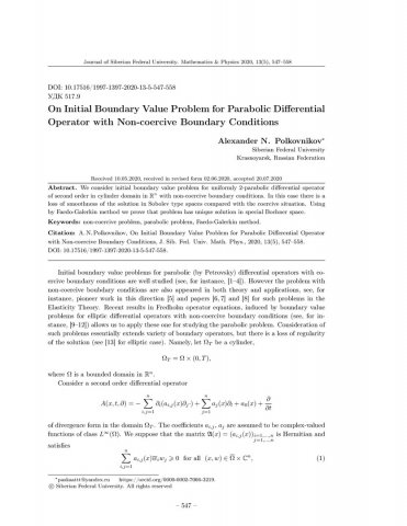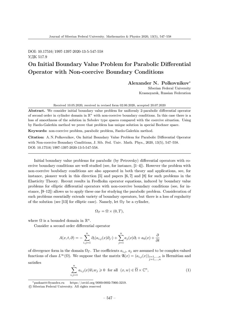 Библиографическое описание:Polkovnikov, Alexander. On Initial Boundary Value Problem for Parabolic Differential Operator with Non-coercive Boundary Conditions = О начально-краевой задаче для параболического дифференциального оператора с некоэрцитивными граничными условиями / A. N. Polkovnikov. - Текст : непосредственный // Журнал Сибирского федерального университета. Математика и физика. - 2020. - Т. 13, № 5. - С. 547–558. - Библиогр.: с. 556-558. - ISSN 1997-1397.