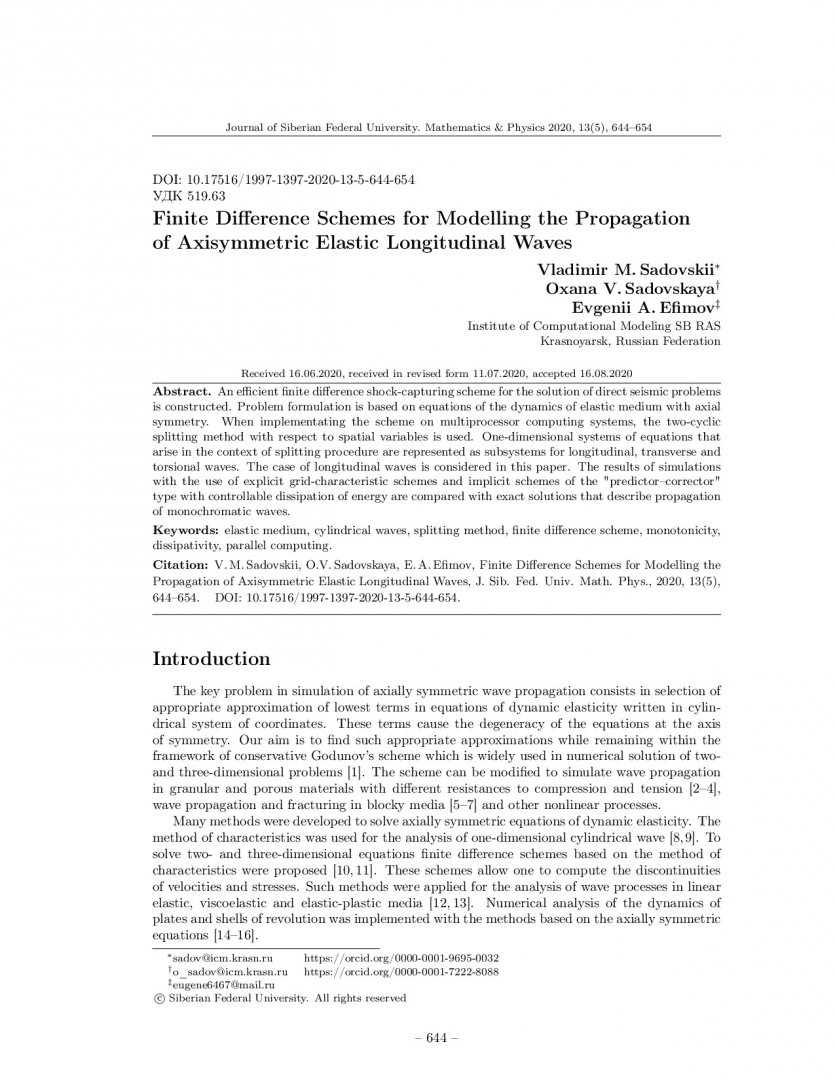 Библиографическое описание:Sadovskii, Vladimir. Finite Difference Schemes for Modelling the Propagation of Axisymmetric Elastic Longitudinal Waves = Разностные схемы для анализа продольных волн на основе осесимметричных уравнений динамической теории упругости / V. M. Sadovskii, O. V. Sadovskaya, E. A. Efimov. - Текст : непосредственный // Журнал Сибирского федерального университета. Математика и физика. - 2020. - Т. 13, № 5. - С. 644–654. - Библиогр.: с. 652-654. - ISSN 1997-1397.